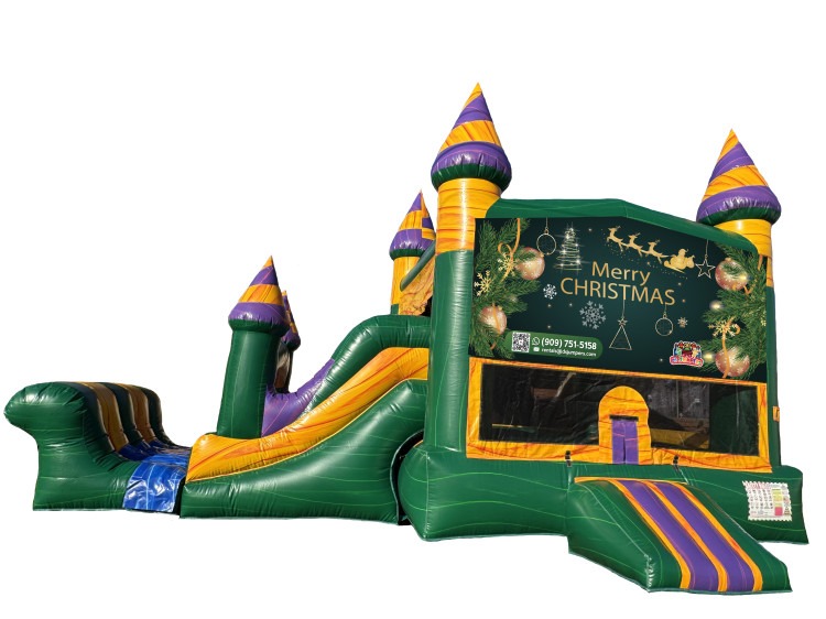 Celebrate the holiday season with the Green Christmas Combo — a festive inflatable that brings Christmas cheer to any event! Featuring bright green, gold, and purple colors with a beautiful Merry Christmas banner, this combo includes a large bounce area and an attached slide for nonstop fun.
