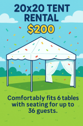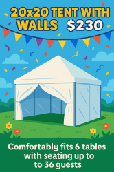 Keep your guests cool, shaded, and comfortable with our 20x20 Tent Rental! Perfect for backyard parties, weddings, school events, and community gatherings, this tent provides reliable cover and plenty of space for seating, food, or activities.