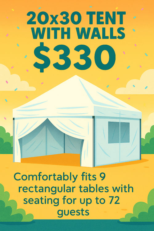Give your event more room to shine with the 20x30 Tent Rental! With extra space for seating, dining, or activities, this tent is perfect for larger gatherings like weddings, festivals, graduations, and community events.