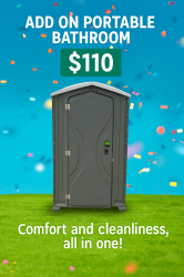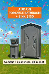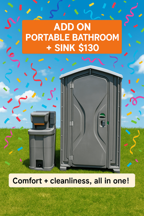 Upgrade your event with our Portable Bathroom with Sink Rental, providing guests with added comfort and convenience. This unit includes a built-in handwashing sink, making it the ideal choice for parks, school events, weddings, and large gatherings where hygiene is a priority. Clean, reliable, and delivered right to your event site, it’s a guest-friendly solution that keeps everyone comfortable.