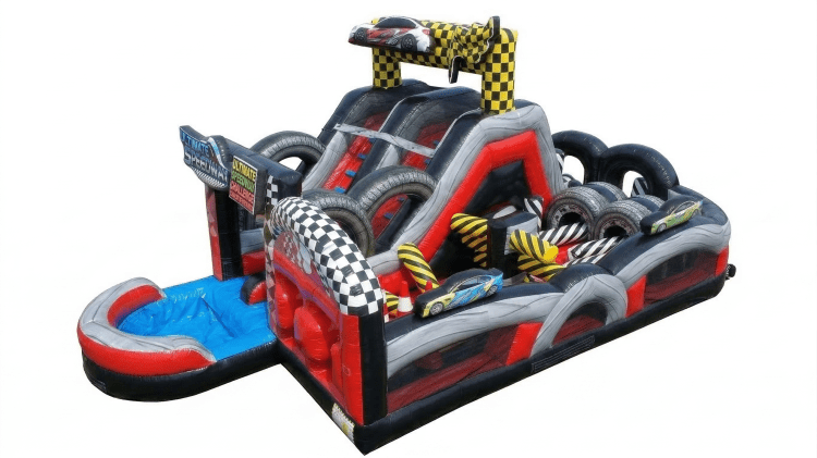 Cool down the track and turn up the heat! The Ultimate Speedway Challenge (Wet) takes all the high-octane racing of our standard course and adds a massive splash at the finish line. Featuring 3D NASCAR-style stock cars, checkered flag pillars, and inflatable tire tunnels, this unit is upgraded with a large landing pool, making it the ultimate summer attraction for racing fans. Drivers will race through the obstacles and fly down the dual slides for a refreshing winner's circle finish!